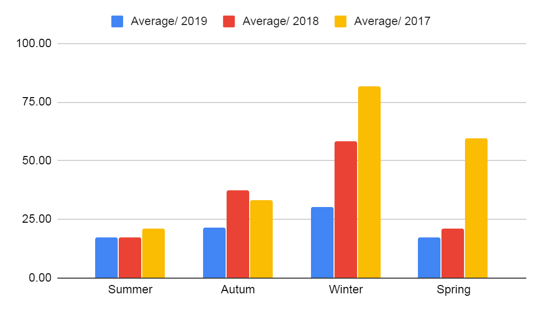 Season wise Average Variation of AQI in Kathmandu, Year: 2017-2019