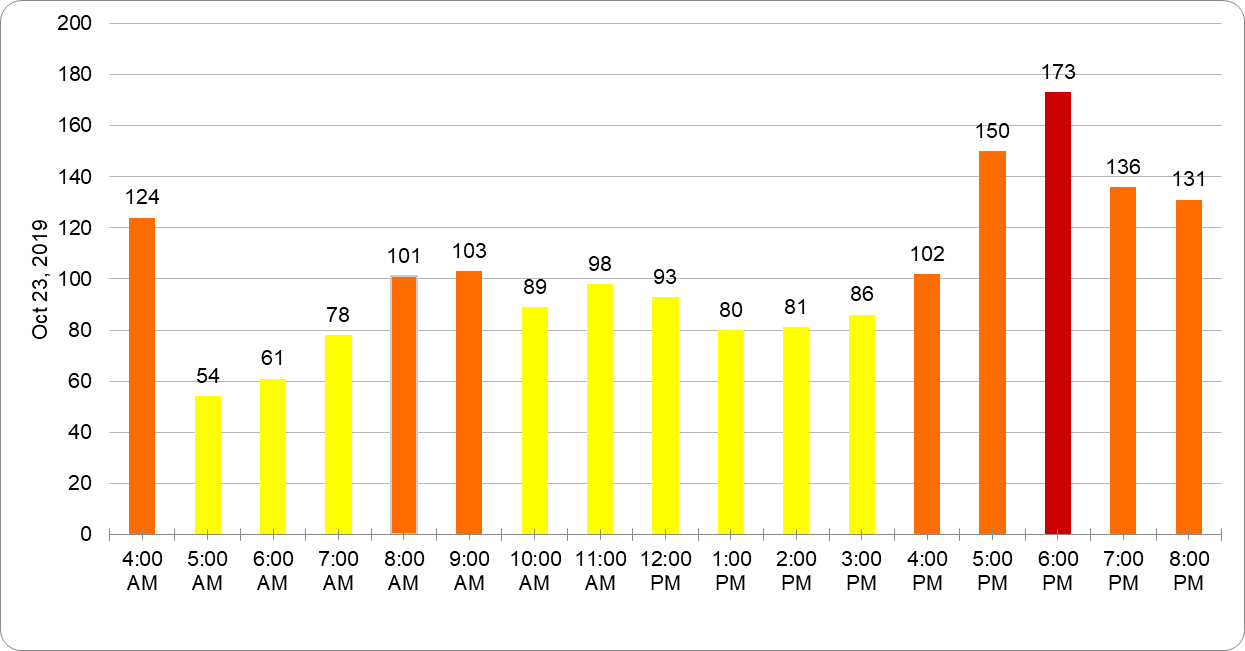 Day wise Variation of AQI in Kathmandu, Year: 2019